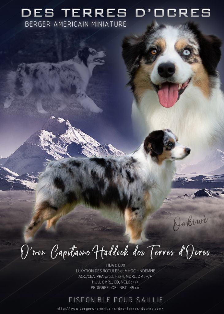 O'mon capitaine Haddock des Terres d'Ocres (dit Ookiwé) est né chez nous, du mariage tant attendu de Moonlight et Iwook. Pour la petite histoire, nous avons failli l'appeler "Junior" tant il ressemble à son père.... mais ça sera finalement "Ookiwé" qui n'est autre qu'un anagramme d'Iwook ! Ookiwé ne ressemble pas que physiquement à son père, il en a hérité également son caractère. C'est un petit clown, hyper sociable et très très joueur.